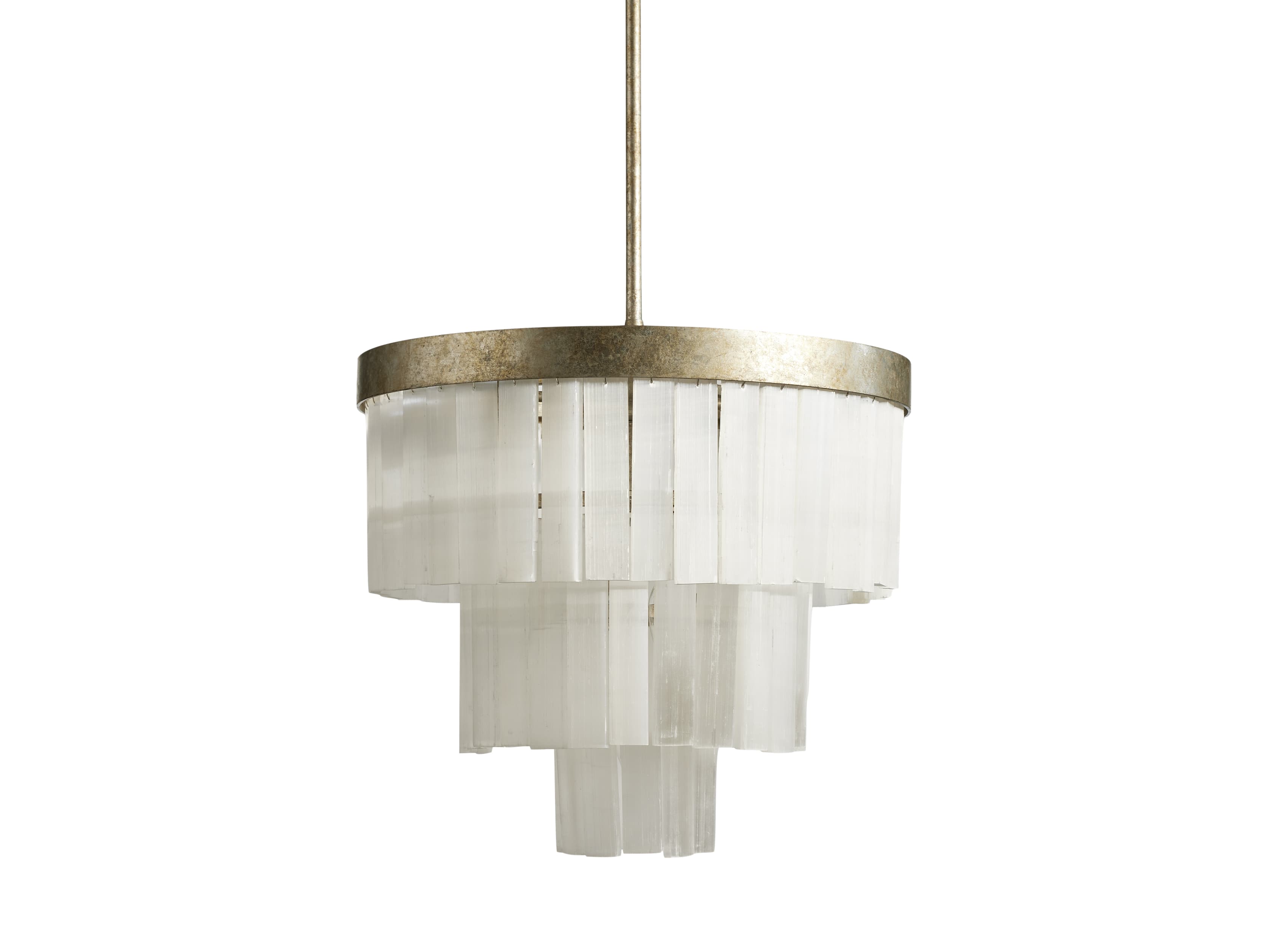 Adorned with natural selenite crystals, our Cameron Lighting Collection reflects light as they hang elegantly beneath the iron frame. An antiqued silver finish is hand-brushed by our artisans, creating a glamorous aesthetic.