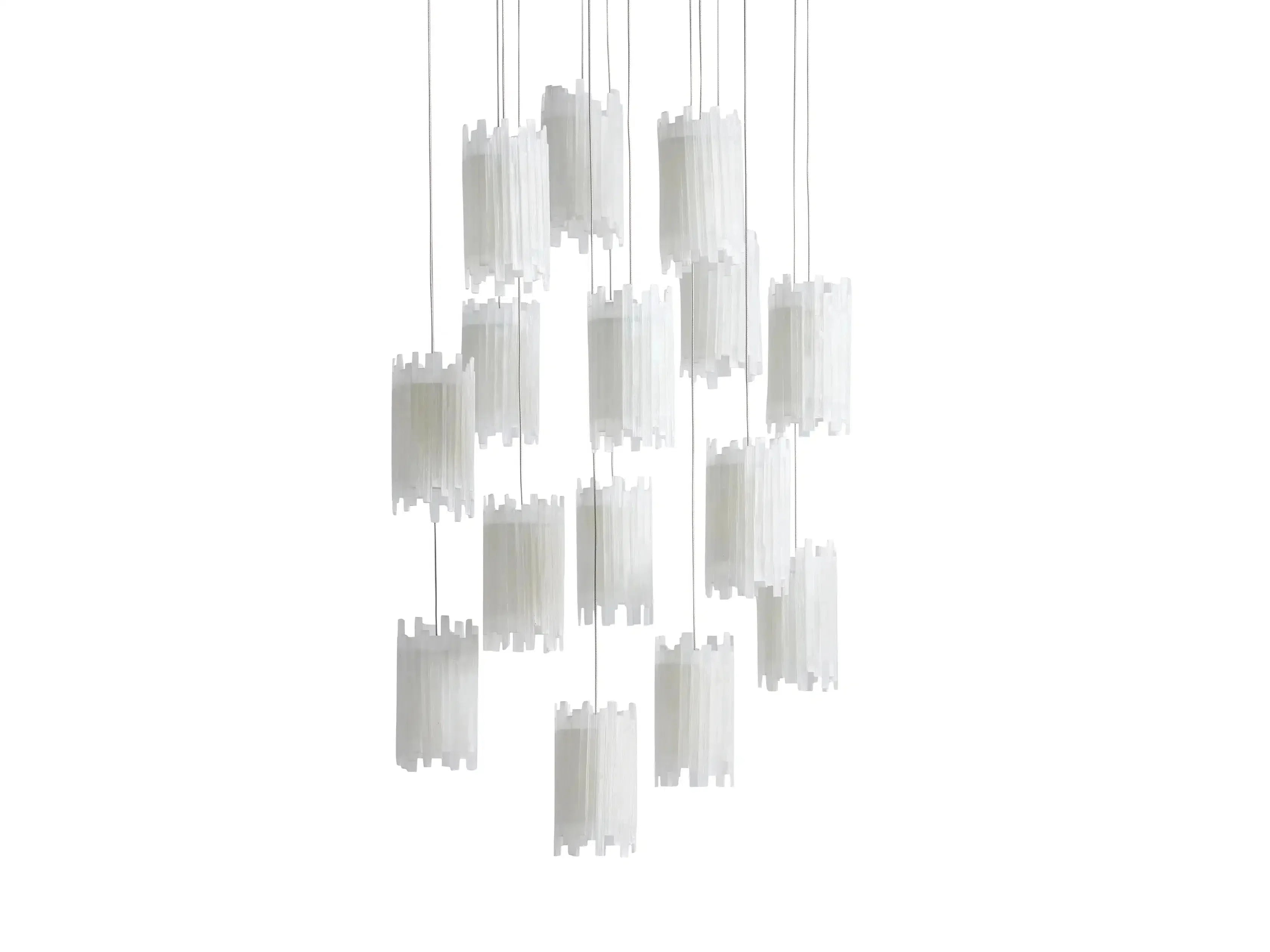 - Made from PVC cables featuring a silver finish with a clear protective lacquer and complemented by pendant shades crafted from natural selenite stone.