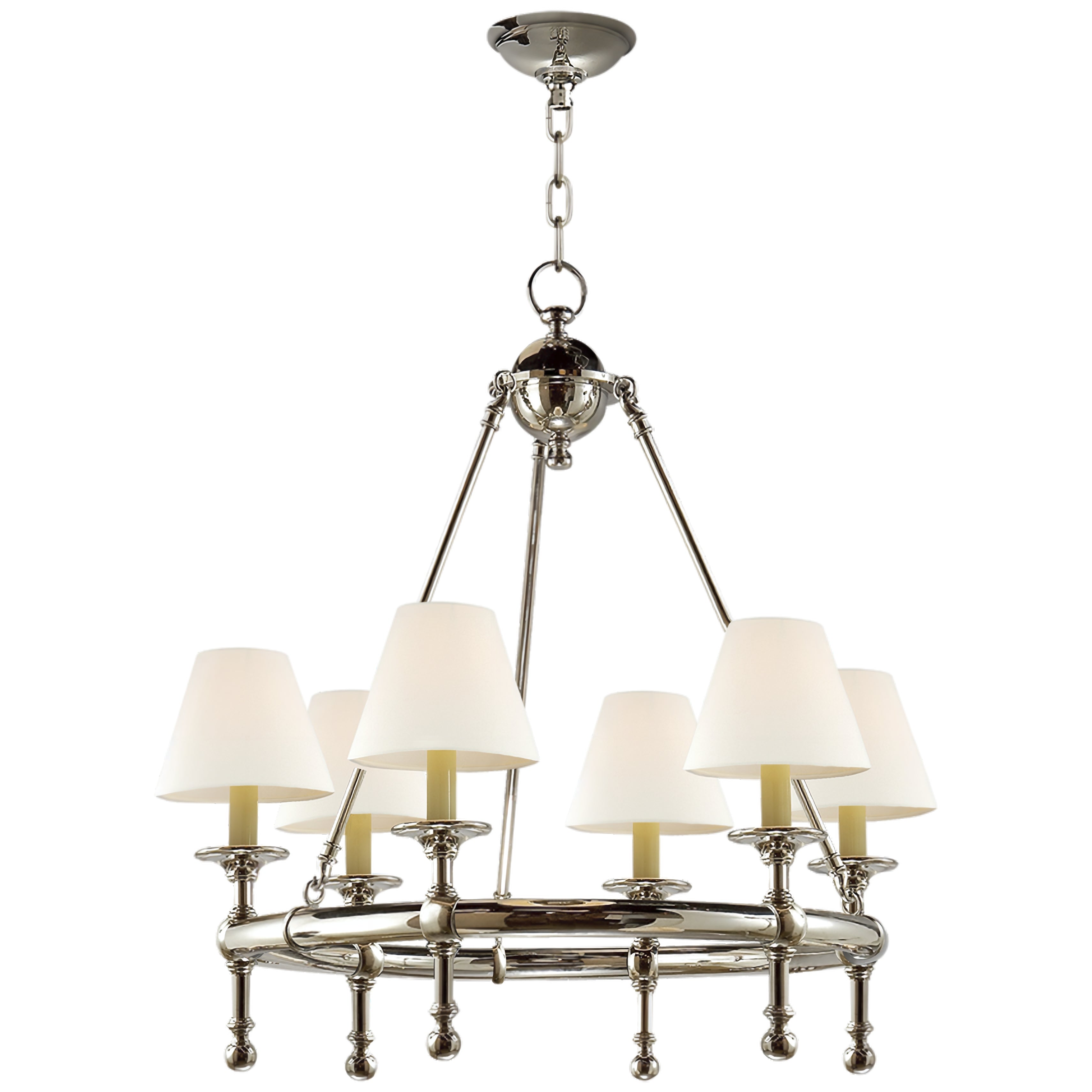 Experience enduring elegance with the Nove Classic Series Chandelier. Featuring a brass base and linen shades, it casts a warm, inviting glow. A perfect blend of luxury and craftsmanship to transform any room.