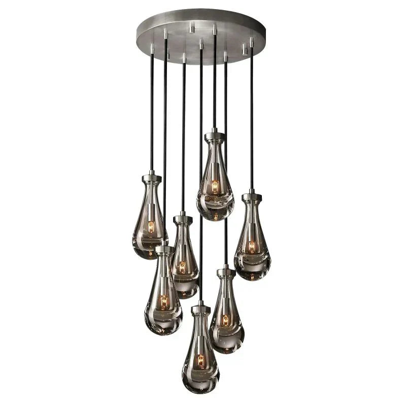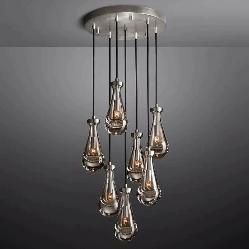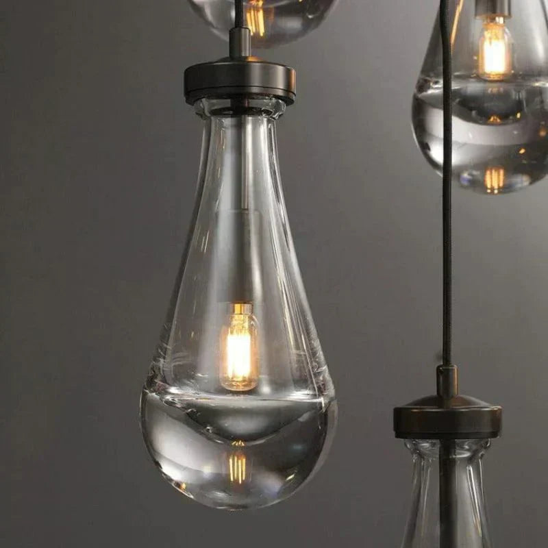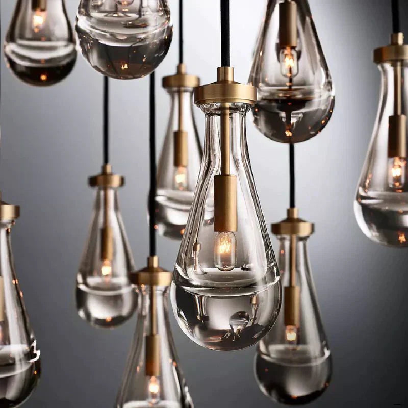 Inspired by the stillness of rainfall, the Raindrop collection brings a sense of calm and fluidity to any space. Hand-blown glass droplets, suspended by slender black cords or mounts, cast soft, rippling reflections across walls and ceilings.