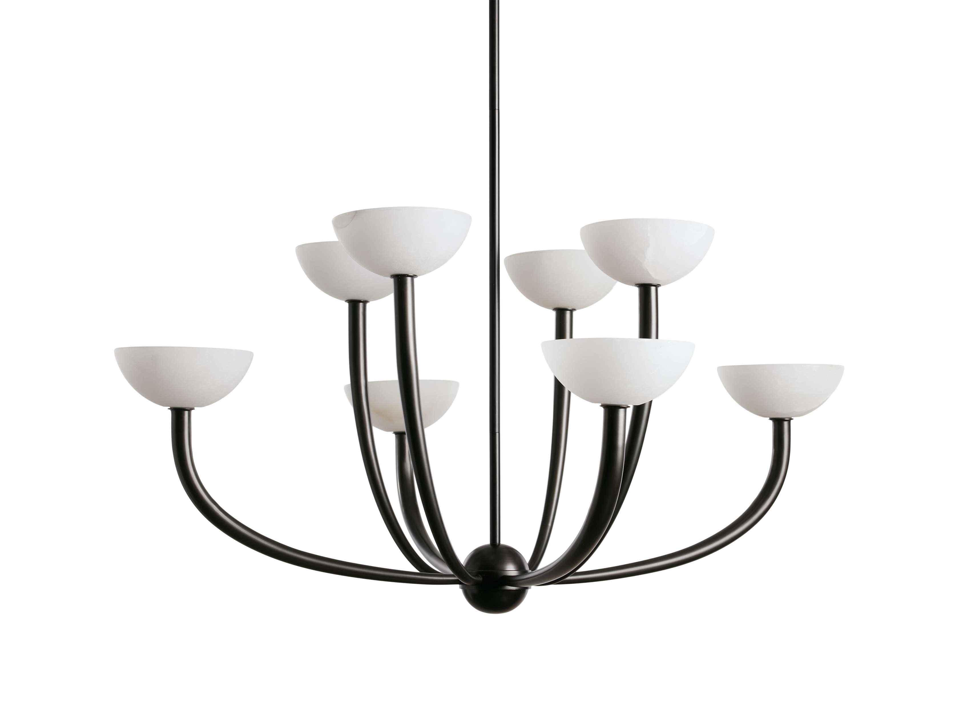 Boasting a contemporary silhouette and natural alabaster shades, our Saguaro Chandelier makes a statement in any space. Each piece features a unique stoving varnish technique to create the antique brass or bronze finishes that complement the cream color tones in the alabaster stone.