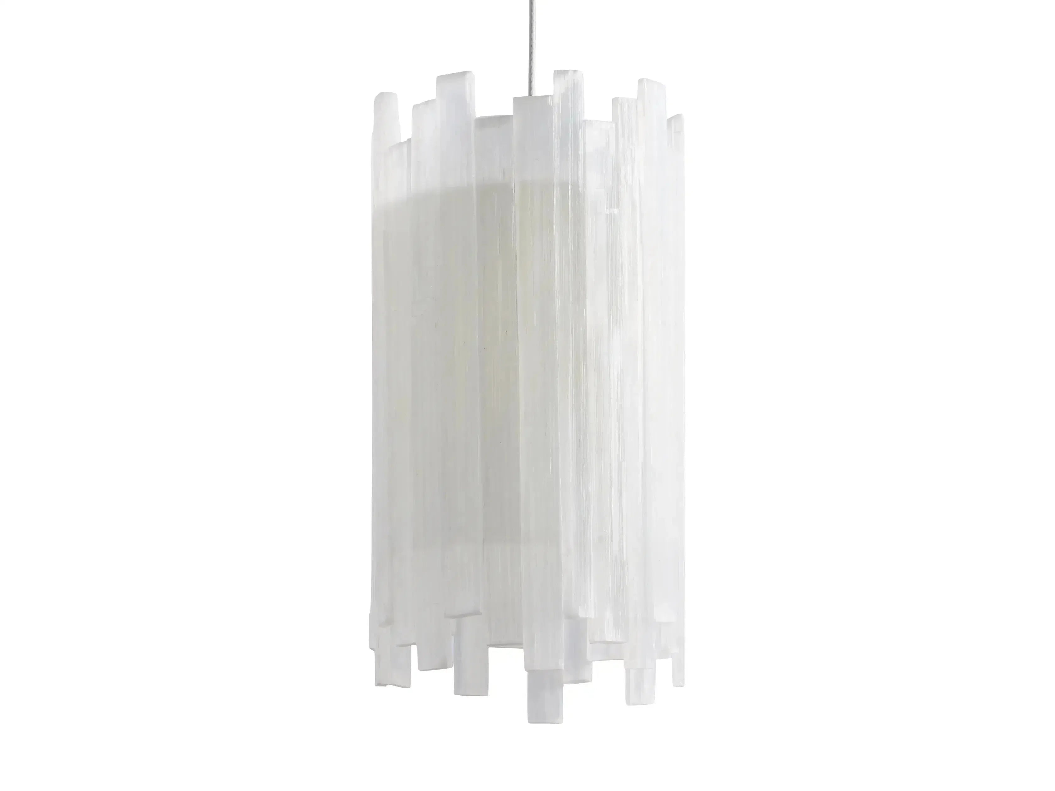 - Made from PVC cables featuring a silver finish with a clear protective lacquer and complemented by pendant shades crafted from natural selenite stone.