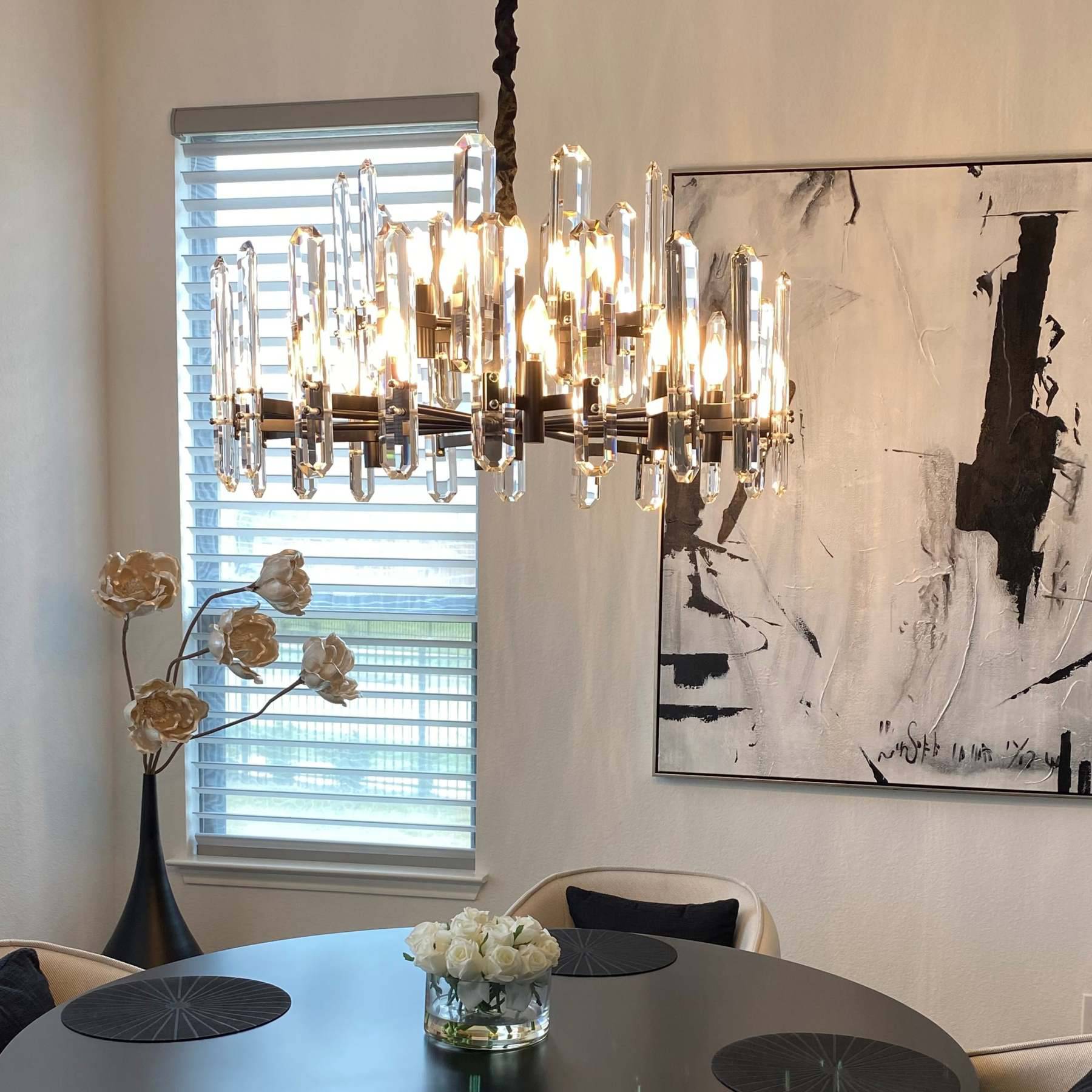 The Monclair Collection draws from mid-century Austrian design, featuring layered rings of cut crystals that scatter light in multiple directions. Clear crystal prisms and a refined metal frame create a radiant, graceful ambiance.