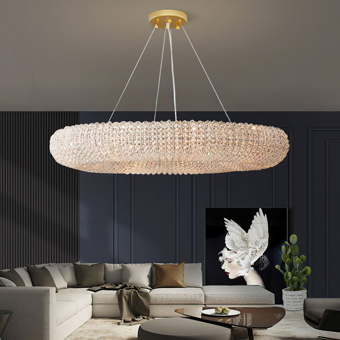 The Halo Collection reimagines the chandelier as a floating sphere of light and texture. Faceted crystal strands are meticulously hand-wrapped around a concealed iron core, creating a luminous form suspended in space with quiet precision.