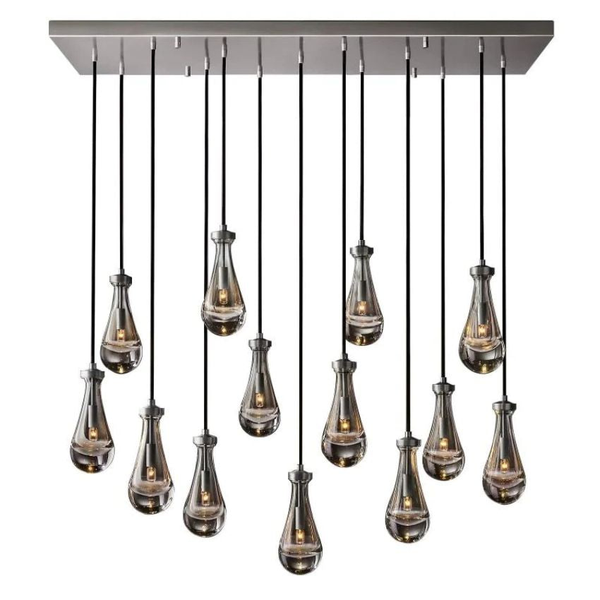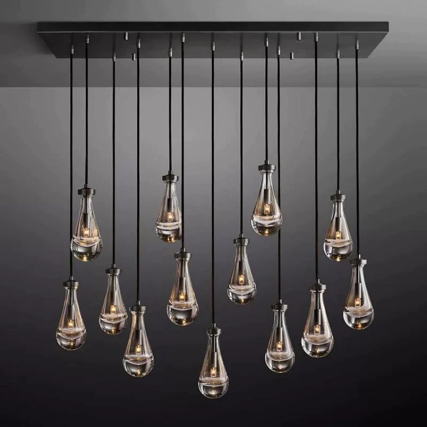 Inspired by the stillness of rainfall, the Raindrop collection brings a sense of calm and fluidity to any space. Hand-blown glass droplets, suspended by slender black cords or mounts, cast soft, rippling reflections across walls and ceilings.