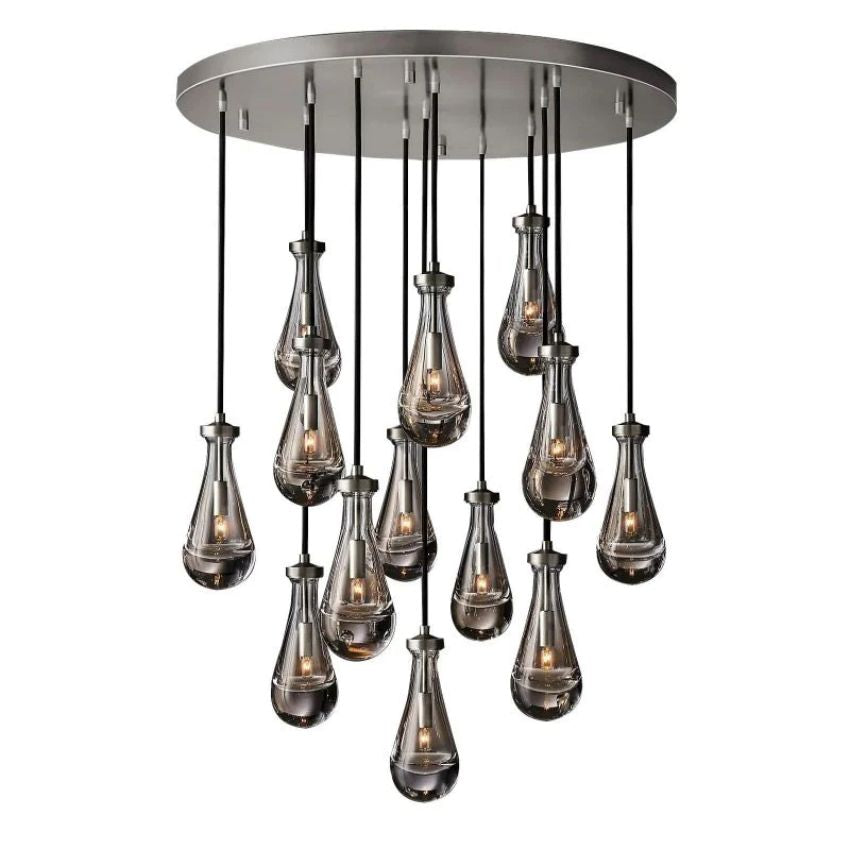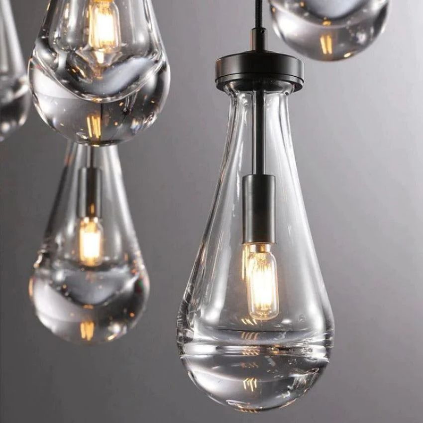Inspired by the stillness of rainfall, the Raindrop collection brings a sense of calm and fluidity to any space. Hand-blown glass droplets, suspended by slender black cords or mounts, cast soft, rippling reflections across walls and ceilings.