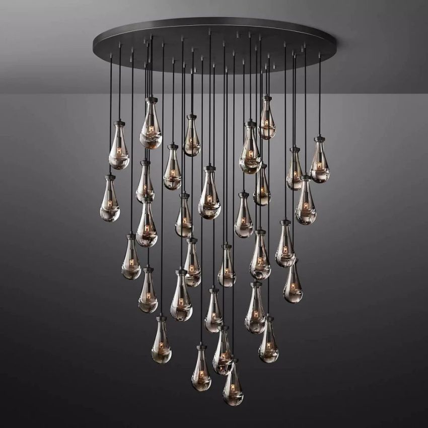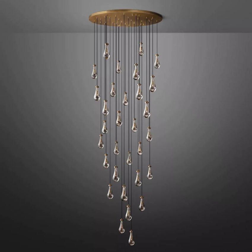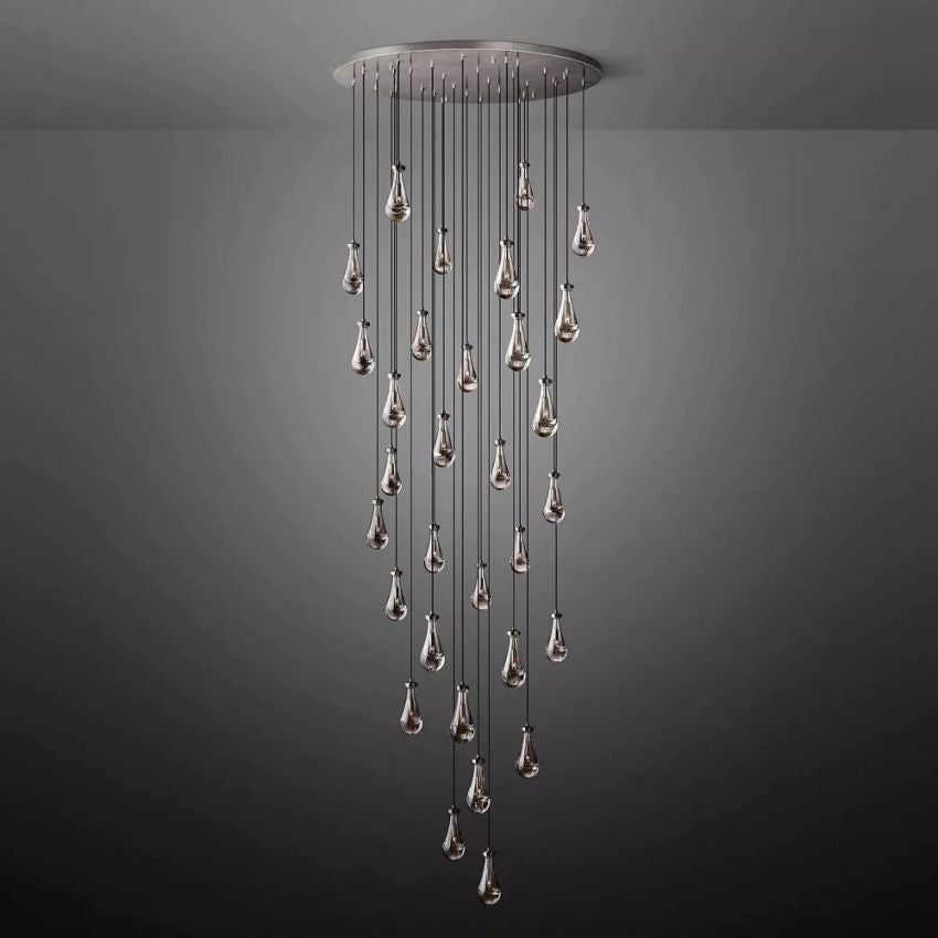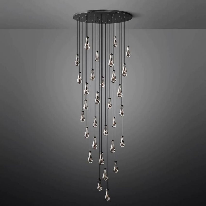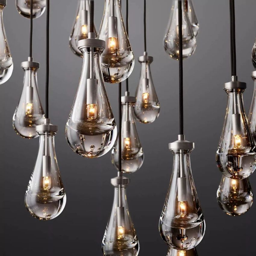Inspired by the stillness of rainfall, the Raindrop collection brings a sense of calm and fluidity to any space. Hand-blown glass droplets, suspended by slender black cords or mounts, cast soft, rippling reflections across walls and ceilings.